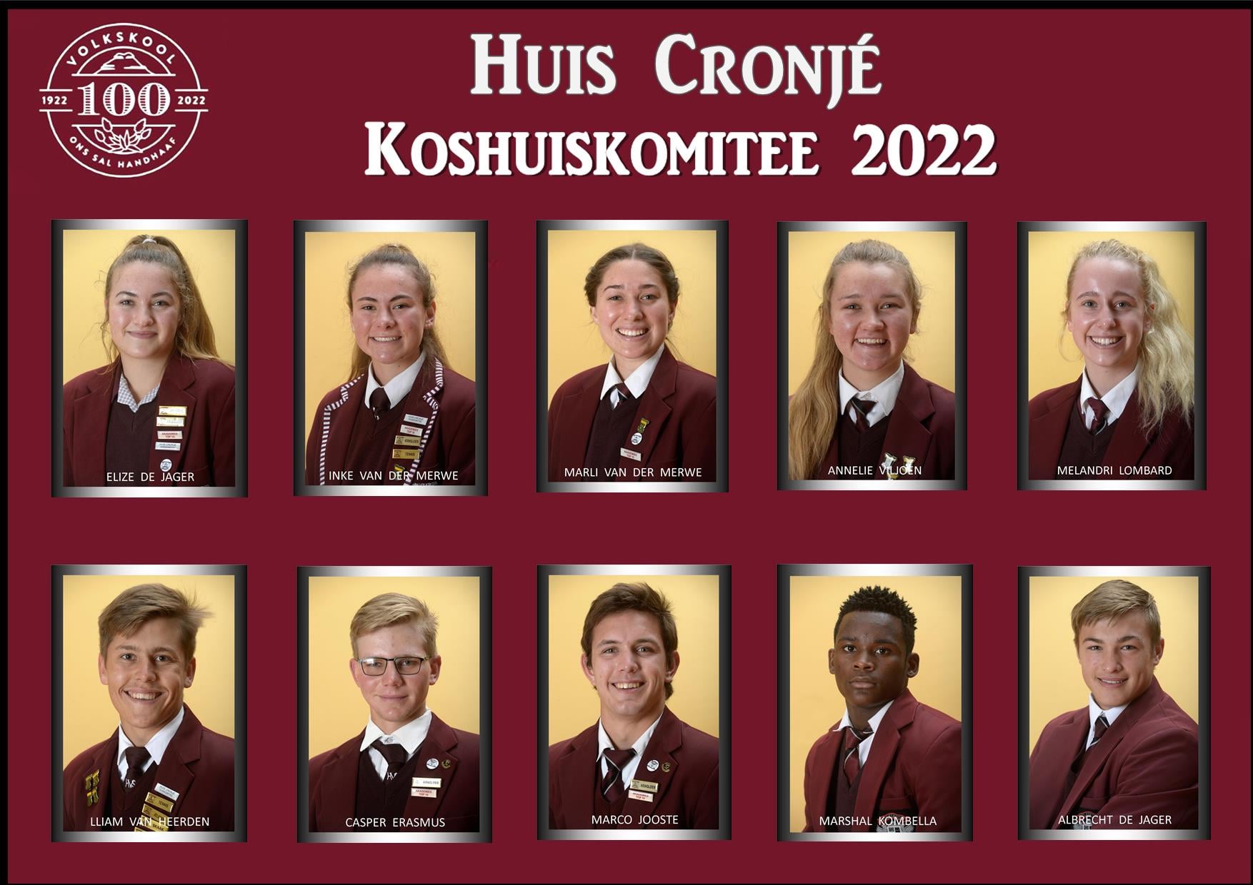 Lees MeerHuis Cronje se Huis Komitee – Hoof en onderhoofleiers Inke van der Merwe (onderhoofdogter), Elize de Jager (Hoofdogter) Lliam van Heerden (Hoofseun) en Casper Erasmus (onderhoofseun)
