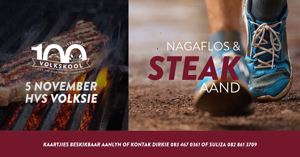 Lees MeerIn aanloop tot ons Eeufeesvieringe in 2022 bied die Volkskool Eeufeeskomitee met trots ‘n NAGAFLOS EN STEAK-AAND aan.Inskrywingsfooie is vir spanne van 2 tot 5 deelnemers en die volgende kategorieë is beskikbaar; Gr 1 – 6 | 2km – R100 Ope | 5km – R250 Ope | 10km – R400 REGISTRASIE begin om 17:00 en die…