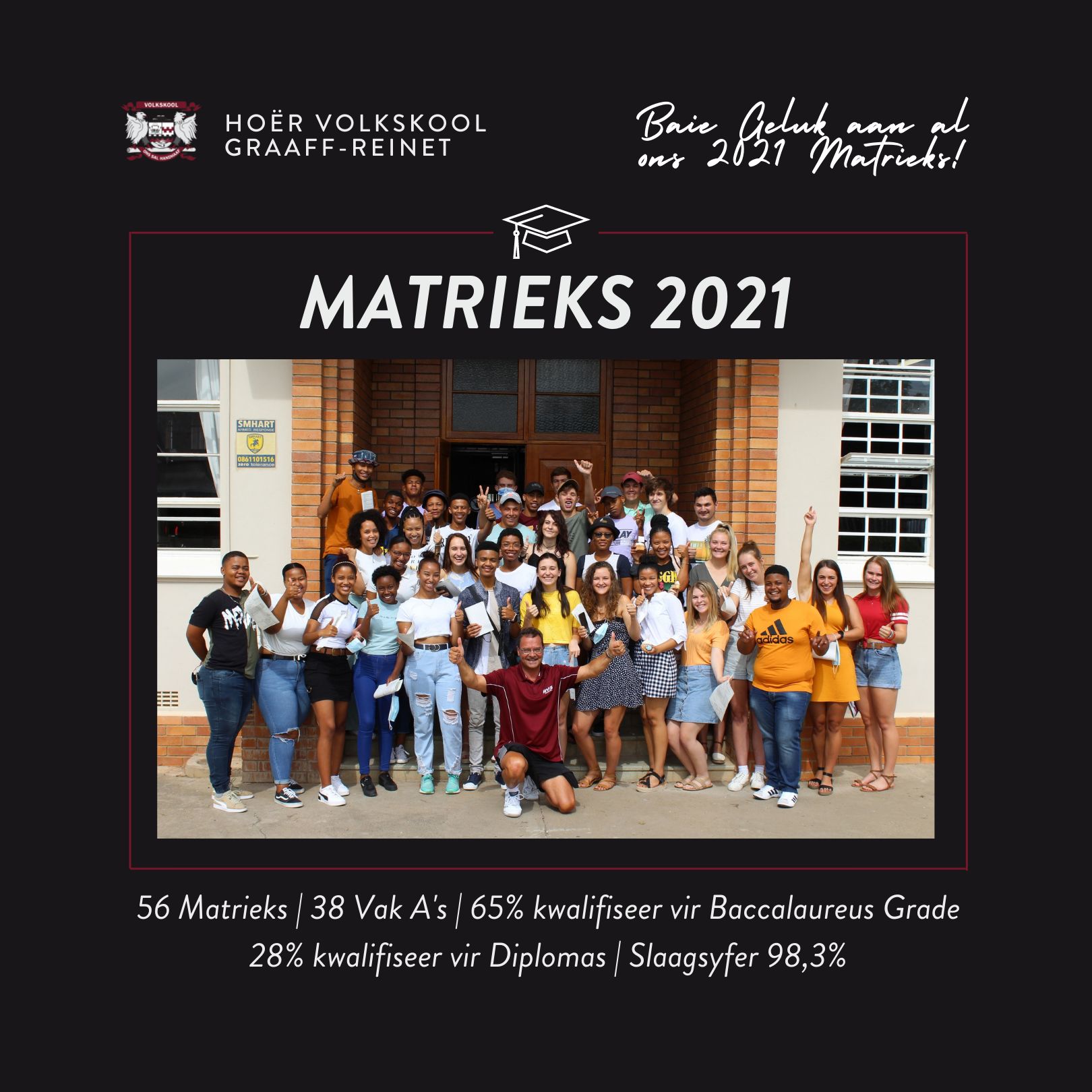 Lees MeerVrydag die 21ste Januarie het gesorg vir groot opgewondenheid met die bekendstelling van die Matriek 2021 finale uitslae. Hoër Volkskool Graaff-Reinet spog met 38 Vak A’s, 65% leerders wat kwalifiseer vir Baccalaureus grade en 28% leerders wat kwalifiseer vir Diplomas. Ons algehele slaagsyfer is 98.3% Ons Top 10: BAIE GELUK aan al die matrikulante van…
