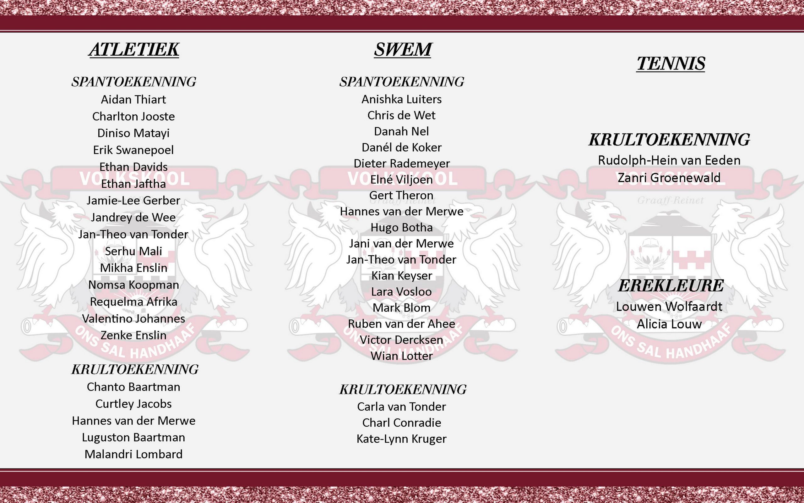 Lees MeerVolkskool het nie teleurgestel by dié jaar se Vlak 3 swemkampioenskap in Kaapstad nie. Die dogters het 3 medaljes huis toe gebring en pragtige persoonlike beste tye opgestel. Hulle het na 12 finale deurgedring en die finale uitslae was as volg: Marlien Crewe-Brown 1ste – 100m borsslag 2de – 50m borsslag 4de – 200 IM…