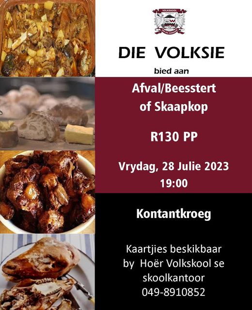 Ons immergewilde skaapkop, afval en beesstertaand is hier! R130 per persoon Vrydag, 28 Julie 2023 19:00 tot laat Die Volksie Kontantkroeg beskikbaar. Kaartjies nou beskikbaar by die skoolkantoor – 049 8910514