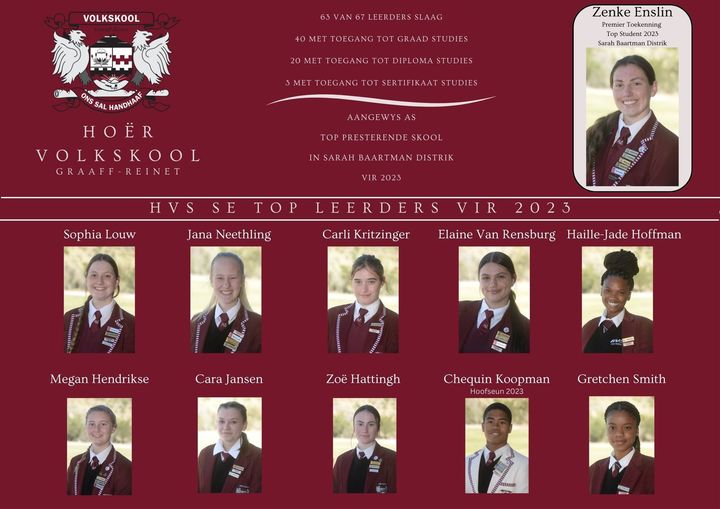 Lees MeerEen van Volkskool se doelwitte is om as top presterende skool in die platteland bekend te staan en ons is vinnig besig om ons doelwit te bereik.Die Top 10-kandidate is as volg: Baie geluk aan die Matriekklas van 2023 met julle goeie uitslae!