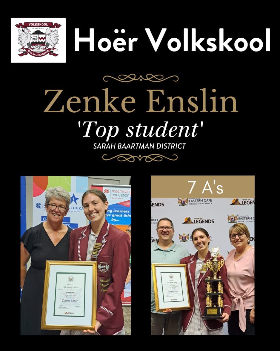 Lees MeerZenke Enslin, as die Top Presteerder van Hoër Volksool, is met trots aangewys as die Top Student in die Sarah Baartman-distrik. Sy gaan Fisioterapie aan die Universiteit van Kaapstad studeer, maar is vasbeslote om haar langtermyn doelwit, naamlik mediese studies te verwesenlik.Zenke Enslin (Gem 88,9%)Afrikaans HT 87%English FAL 88%Lewensoriëntering 87%Wiskunde 90%Fisiese Wetenskap 89%Lewenswetenskap 85%Rekeningkunde 96%Sy…