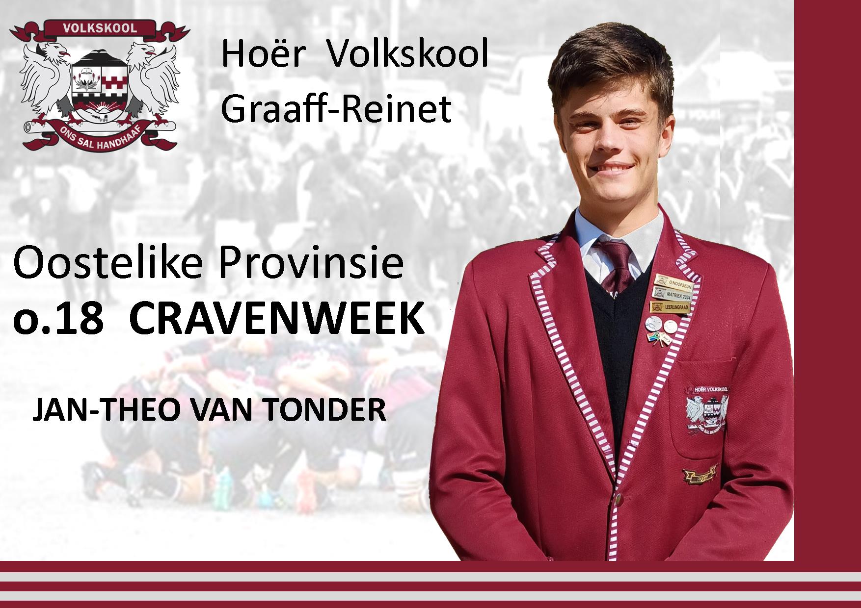 Lees MeerNa afgeloop van die naweek se Meyer Sauerman Rugbytoernooi wat in Kariega aangebied is, kondig Hoër Volkskool met trots aan dat Jan-Theo van Tonder, in die Oostelike Provinsie se 0.18 Cravenweekspan ingesluit is. Die span neem by Hoërskool Monument in Krugersdorp, vanaf 24 – 29 Junie 2024 deel. Baie geluk, Jan-Theo!
