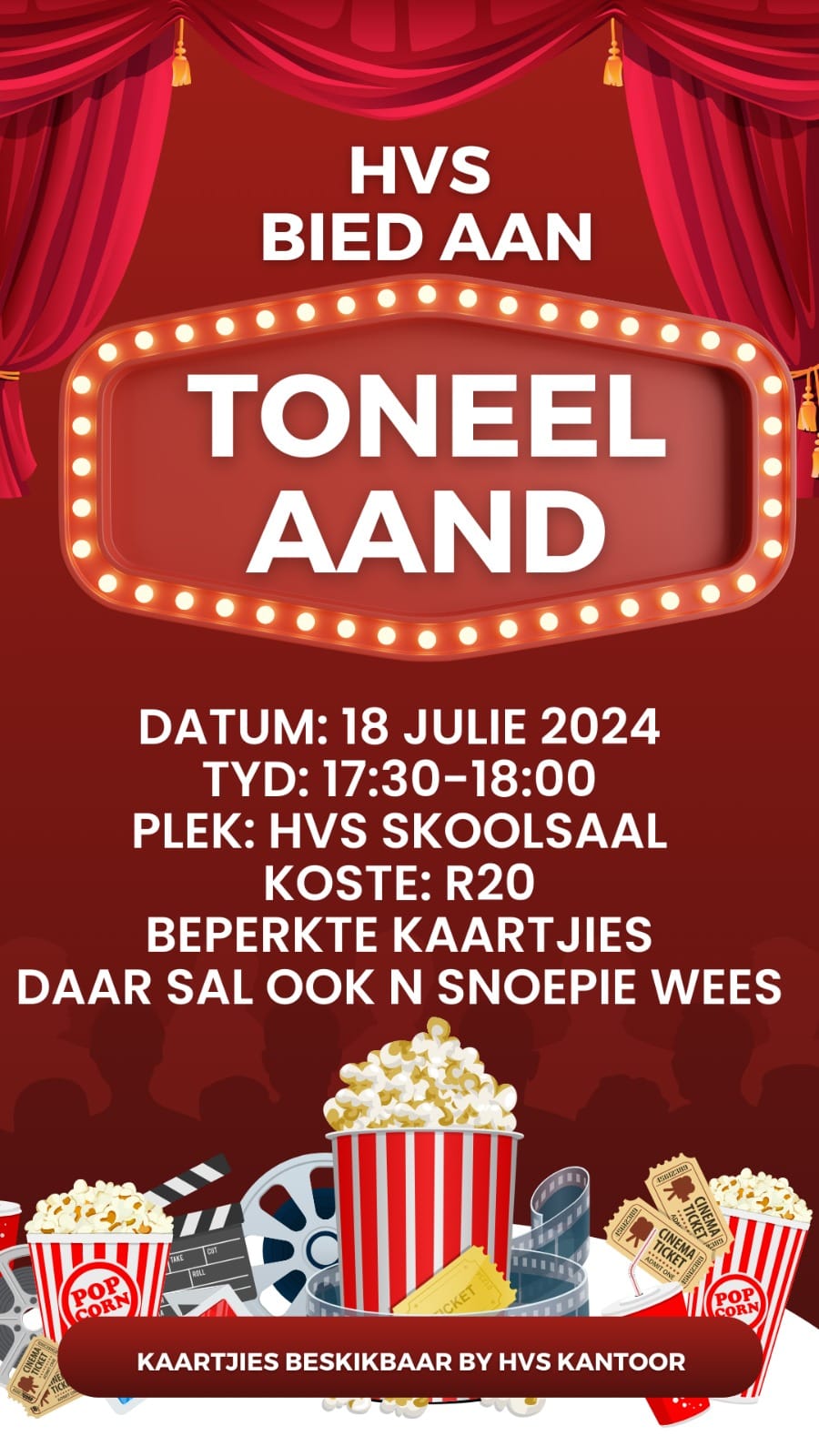 Lees MeerHoër Volkskool se talentvolle dramagroep bied op 18 Julie 2024 ‘n TONEELAAND aan.Kaartjies is by die skoolkantoor beskikbaar.