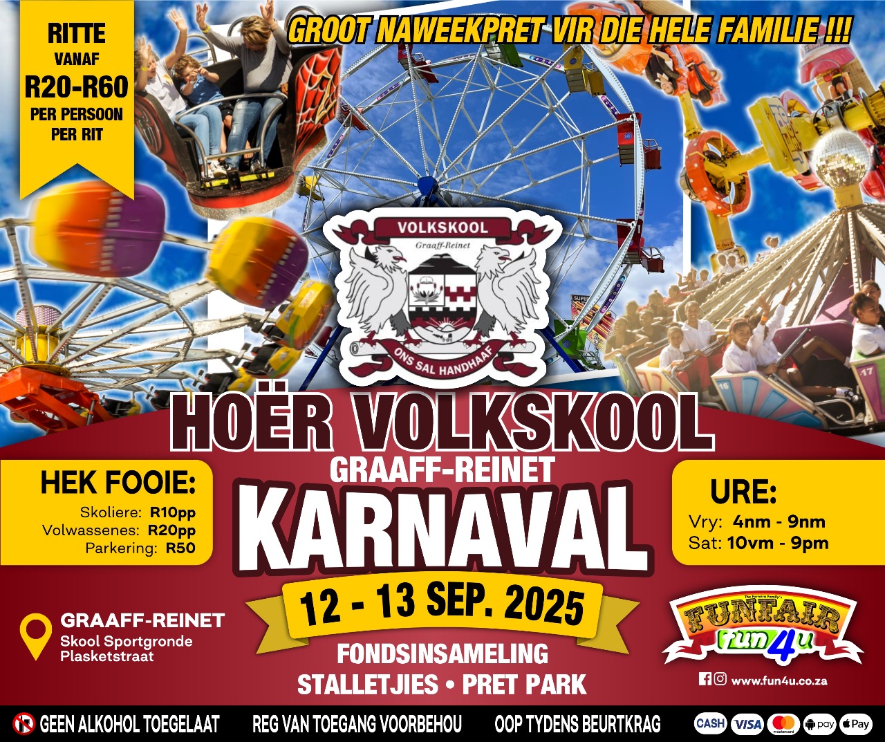 Volkskool is trots gasheer van die Fun4U Fun Fair! 🎠Die Fun4u FunFair kom weer na Graaff-Reinet, maar hierdie keer op Hoër Volkskool se skoolgronde! Ons is trots om gasheer te wees vir hierdie kleurvolle karnaval op 12 en 13 September 2025. Dis ’n naweek wat beloof om vol lag, gees en gesinsplesier te wees: van…