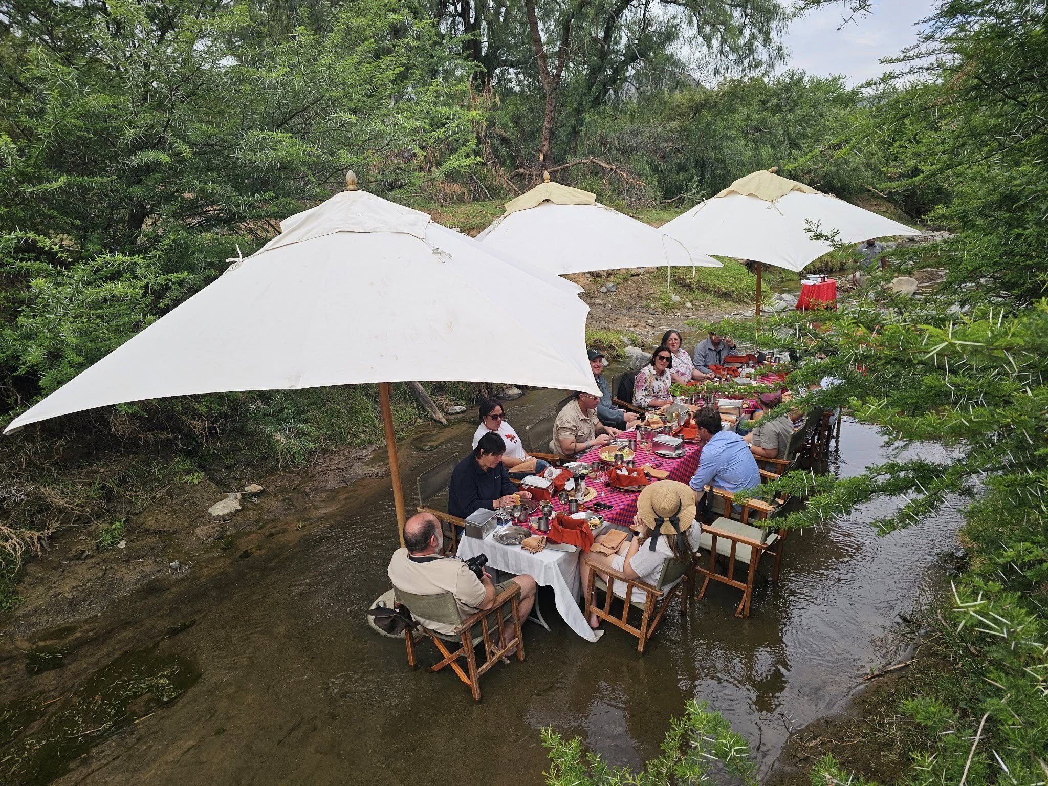 Die veld se stilte en oop ruimtes het vir almal ’n gevoel van vrede gebring tydens ’n ontspannende wildrit, waar die skoonheid van die Karoo ons telkens laat besef het hoe bevoorreg ons is. Daarna het ’n besondere bederf gewag – ’n middagete in die koel stroomwater, met voete in die sand en goeie geselskap om die tafel.