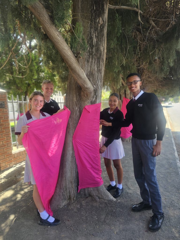 By Volkskool het ons leerders besluit om hul steun op ’n simboliese manier te wys deur die bome by die kampusingang met pienk lap te versier. Hierdie kleurvolle vertoning dien as teken van hoop en medelye met almal wat deur borskanker geraak is – die vegters, oorwinnaars en geliefdes wat saam hul pad stap.