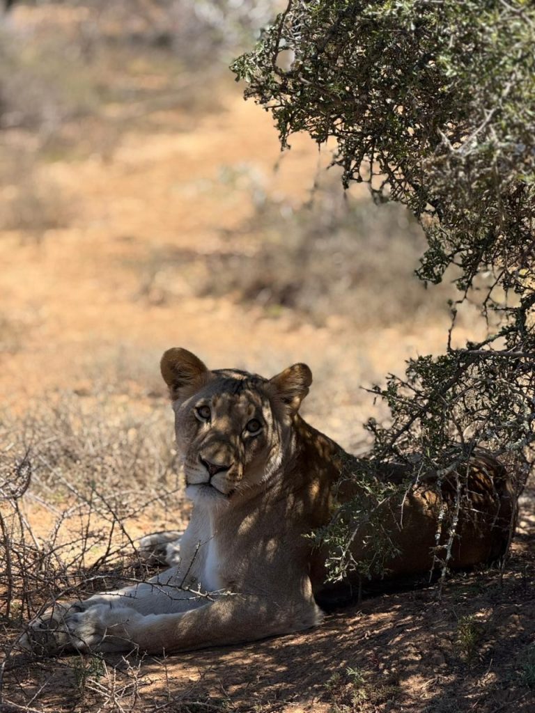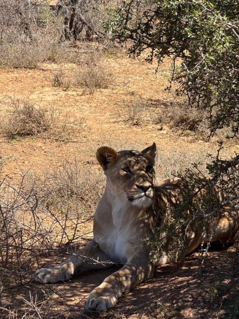 Die laaste, groot ontmoeting van die dag was met ’n leeuwyfie wat in die pad verskyn het en toe rustig onder ’n bos gaan lê het. Die groep het ’n ruk lank daar gesit en haar bewonder. Toe die motor aangeskakel word, het sy geskrik en vinnig opgespring – net genoeg om almal weer bewus te maak van haar teenwoordigheid.